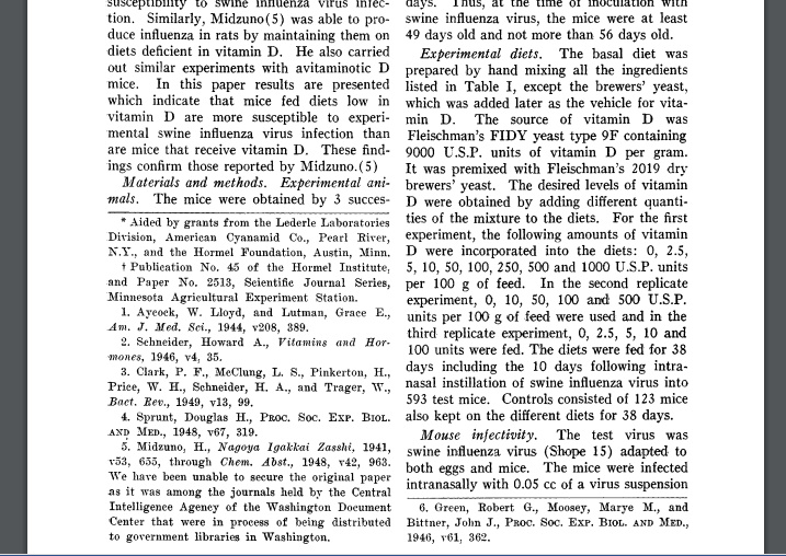 "It is worth noting that one animal study indicated vitamin D, when added to the diet of rats, prevented influenza but a subsequent paper reported it did not [83, 84]. Young et al also reported that a Japanese researcher, Midzuno, was able to reproduce influenza in rats simply by maintaining them on diets deficient in vitamin D, apparently part of Japan's World War II biological weapons research. (The American CIA confiscated Midzuno's papers after the war.)"